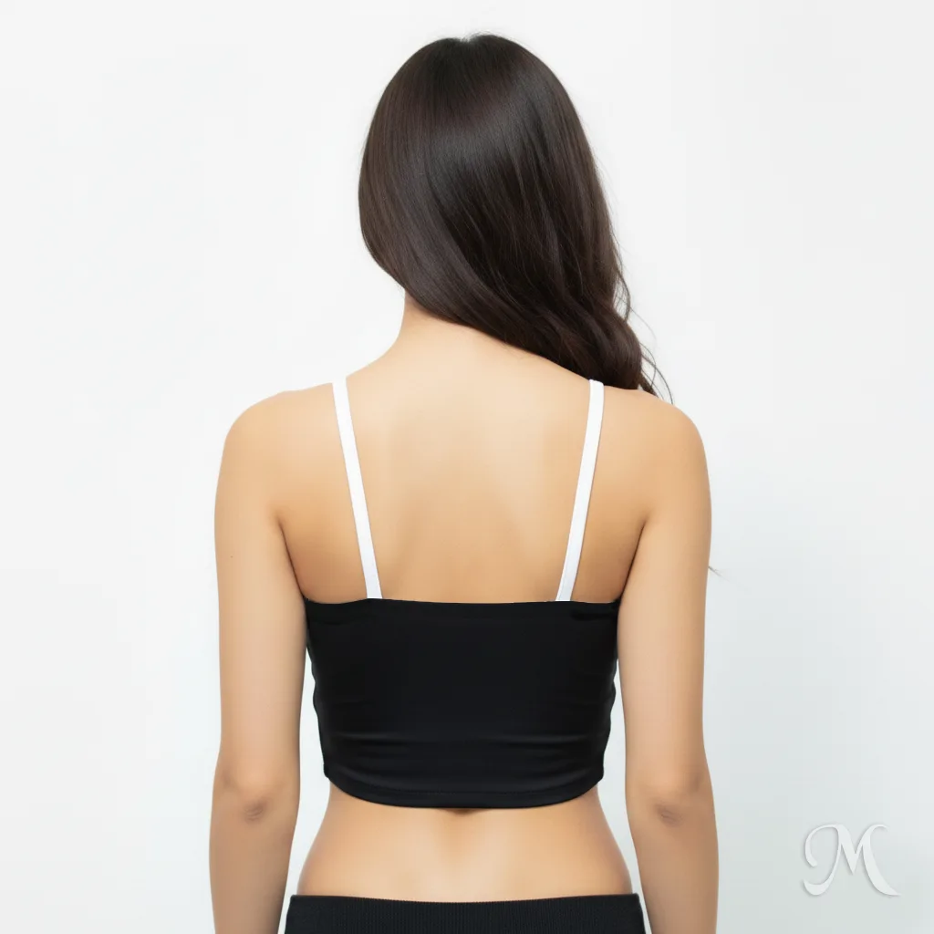 Diseño Trasero: La espalda mantiene un look deportivo y elegante con un diseño minimalista de solo dos tirantes verticales en blanco sobre la tela negra, garantizando un soporte cómodo sin sacrificar el estilo.