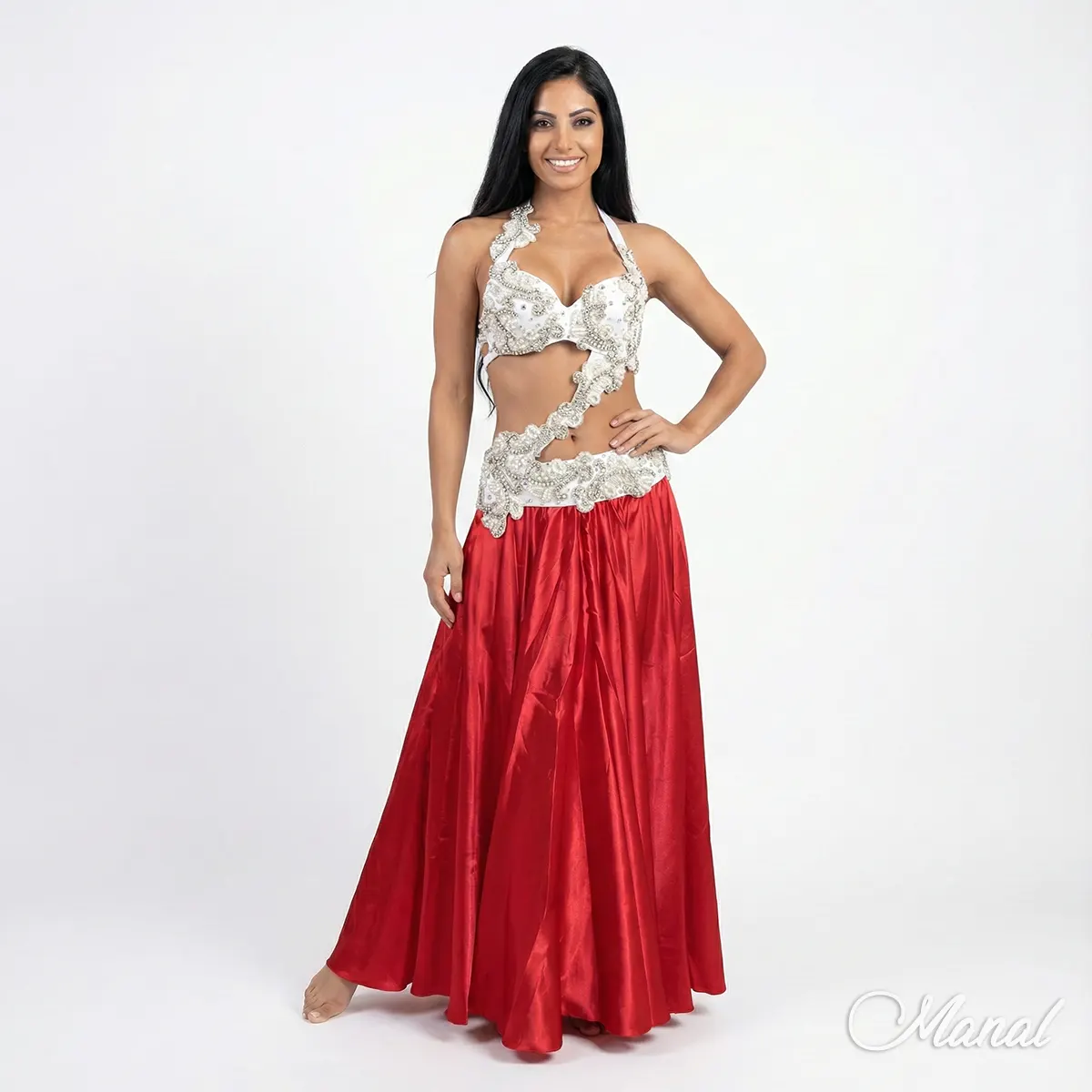 Elegante traje de danza árabe finamente bordado con perlas, mostacillas y pedrería.